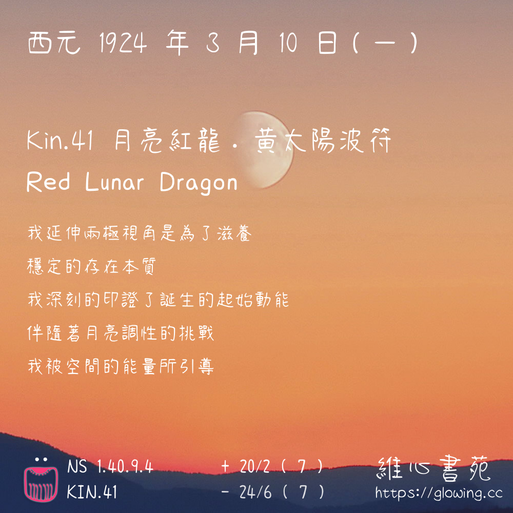 我們可以稱 KIN 41 為 【月亮紅龍】 、 【月亮的紅龍】 、 【黃太陽波符 之 月亮紅龍】 也可以是 【月亮紅龍.黃太陽波符】 ,你比較喜歡哪一個稱號呢?