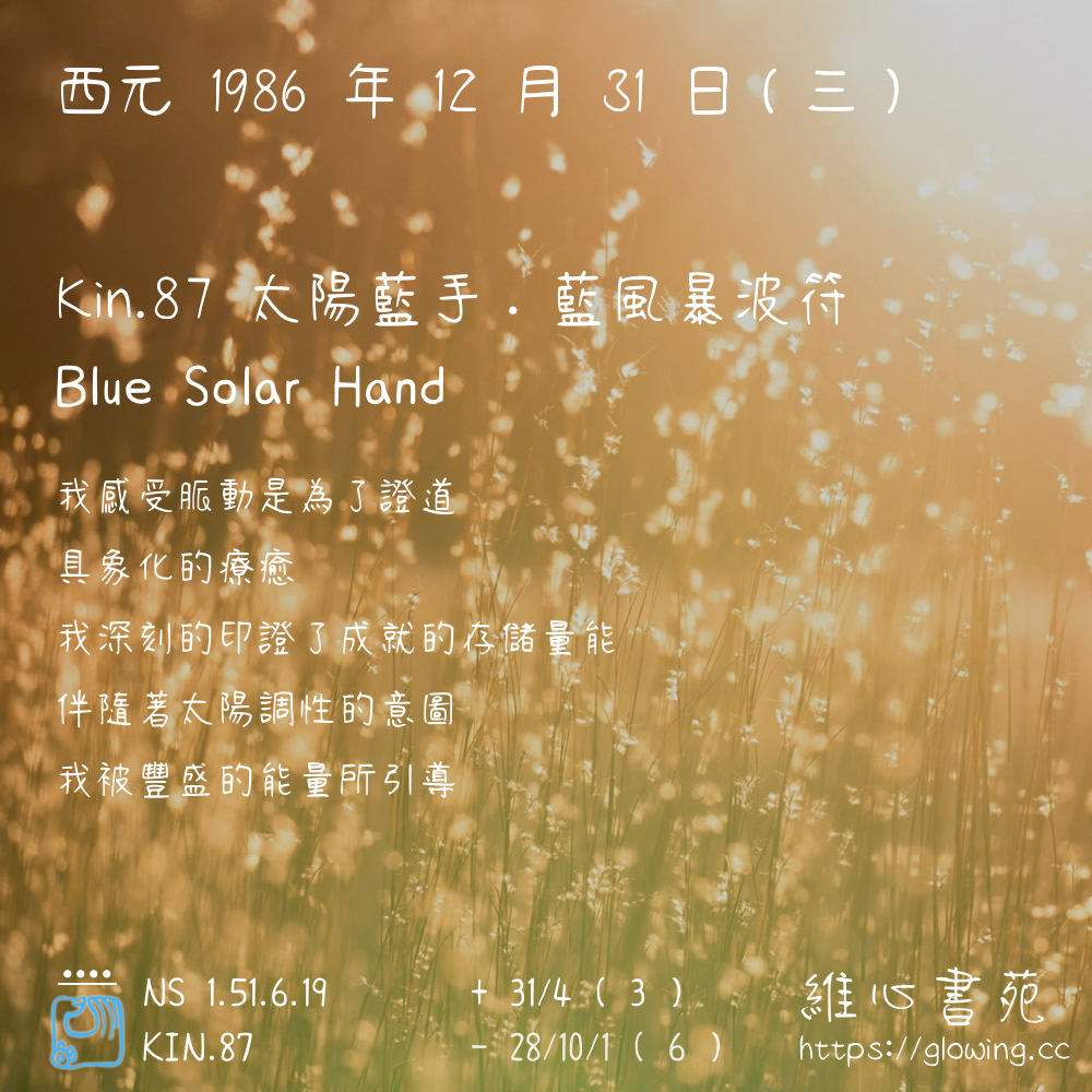 我們可以稱 KIN 87 為 【太陽藍手】 、 【太陽的藍手】 、 【藍風暴波符 之 太陽藍手】 也可以是 【太陽藍手.藍風暴波符】 ,你比較喜歡哪一個稱號呢?