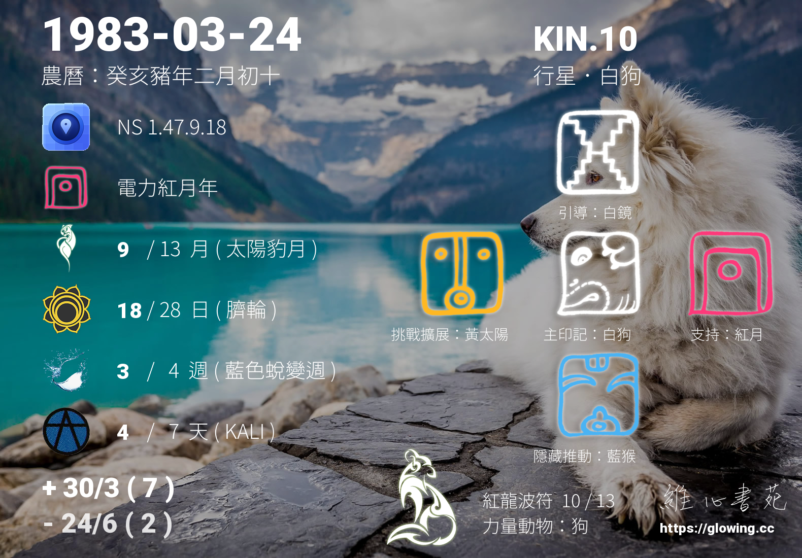 白狗的引導依據KIN的調性不同會有五種可能性,KIN.10的引導圖騰是白鏡 , 白鏡引導著我們認清自我,為我們的未來留下紀錄,將我們每一個思緒紀錄在天體運行中,在我們回歸的那個當下,迴向各所有的存在與眾生,為這個世界留下美麗色彩。