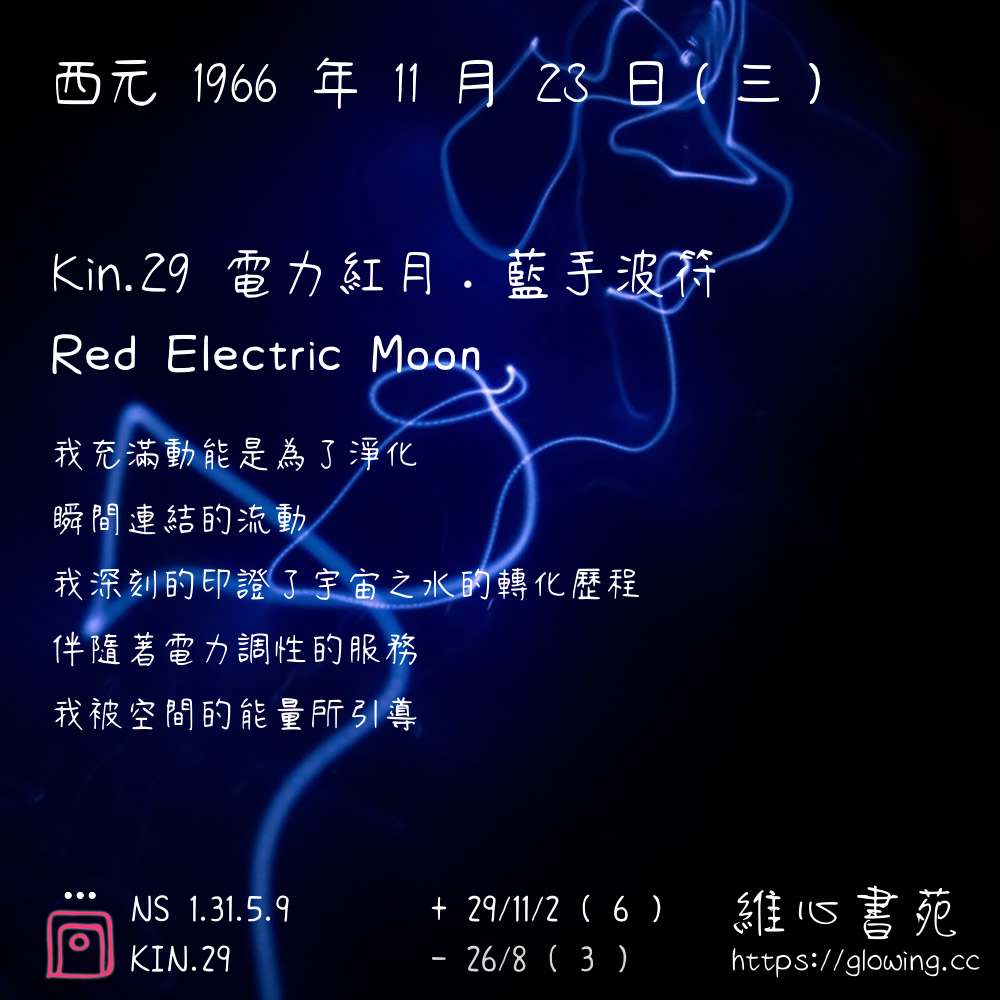 我們可以稱 KIN 29 為 【電力紅月】 、 【電力的紅月】 、 【藍手波符 之 電力紅月】 也可以是 【電力紅月.藍手波符】 ,你比較喜歡哪一個稱號呢?