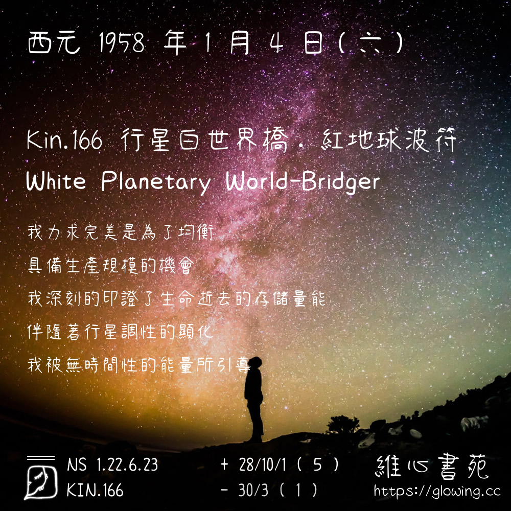 我們可以稱 KIN 166 為 【行星白世界橋】 、 【行星的白世界橋】 、 【紅地球波符 之 行星白世界橋】 也可以是 【行星白世界橋.紅地球波符】 ,你比較喜歡哪一個稱號呢?