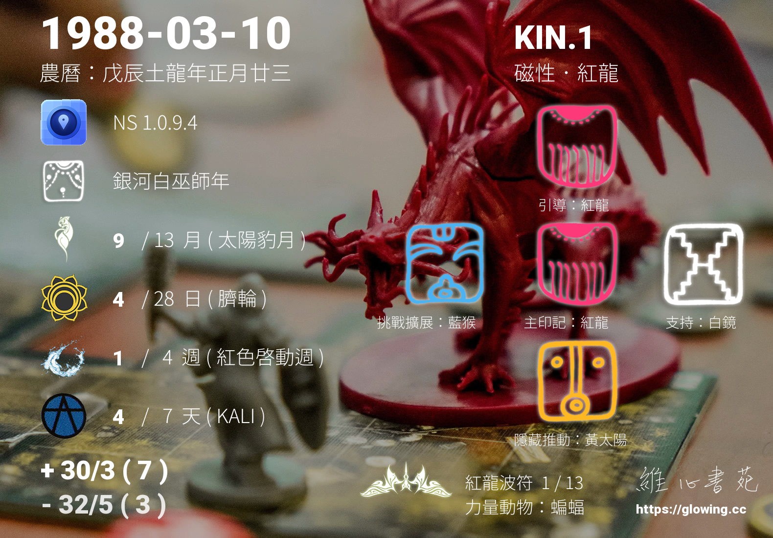 KIN.1 位於 紅龍波符 13 天中的第 1 天,銀河音階為調性 1