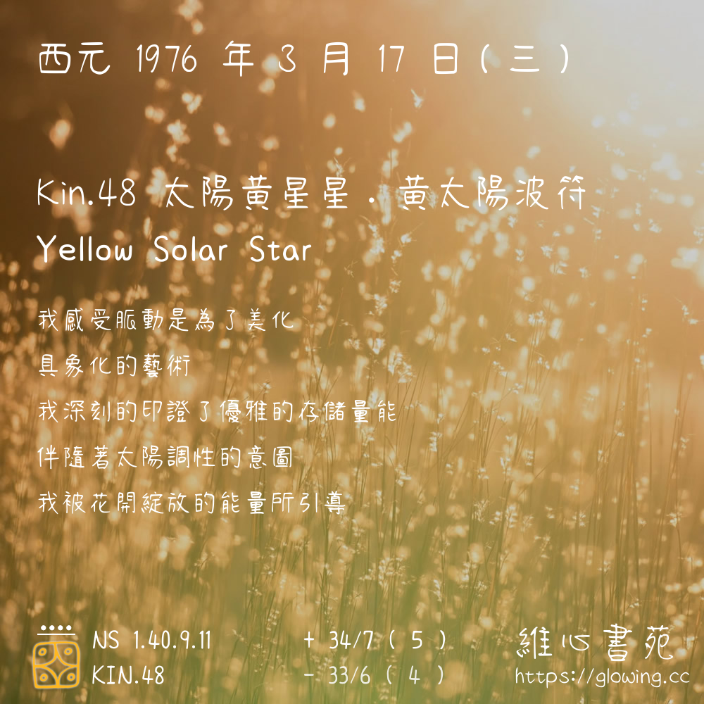 我們可以稱 KIN 48 為 【太陽黃星星】 、 【太陽的黃星星】 、 【黃太陽波符 之 太陽黃星星】 也可以是 【太陽黃星星.黃太陽波符】 ,你比較喜歡哪一個稱號呢?