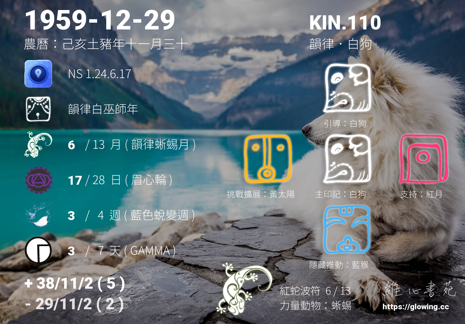 白狗的引導依據KIN的調性不同會有五種可能性,KIN.110的引導圖騰是白狗 , 沒有白狗的引導,我們沒有辦法體會到具象的愛,真實的能量流動,需要伴隨著具象的行為模式,白狗的愛相當的純粹、自然且生動現實,我們可以全然的接受,那發自內心毫無一絲污漬的潔淨純白。