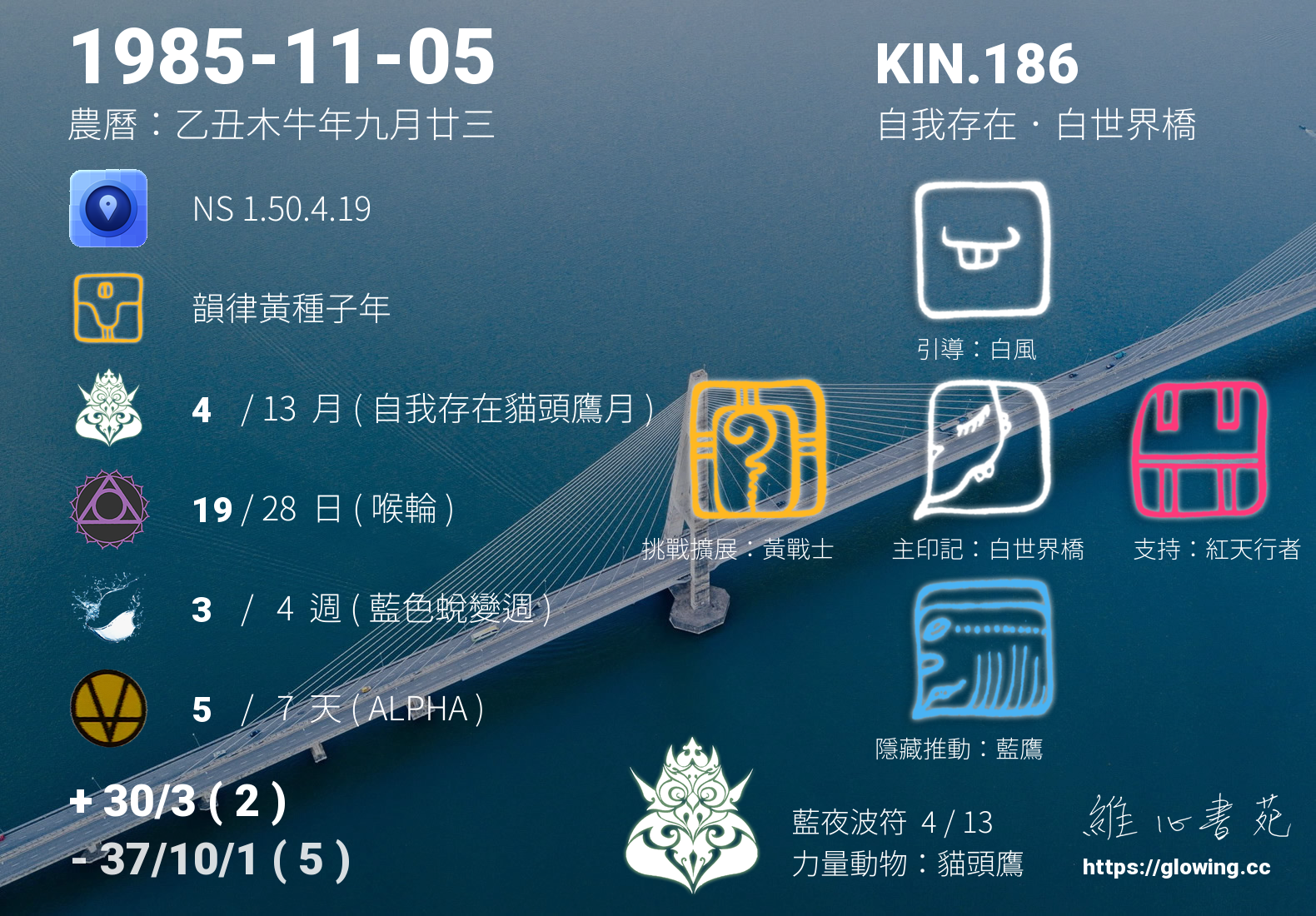 我們可以稱 KIN 186 為 【自我存在白世界橋】 、 【自我存在的白世界橋】 、 【藍夜波符 之 自我存在白世界橋】 也可以是 【自我存在白世界橋.藍夜波符】 ,你比較喜歡哪一個稱號呢?