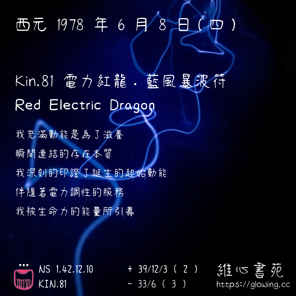 我們可以稱 KIN 81 為 【電力紅龍】 、 【電力的紅龍】 、 【藍風暴波符 之 電力紅龍】 也可以是 【電力紅龍.藍風暴波符】 ,你比較喜歡哪一個稱號呢?