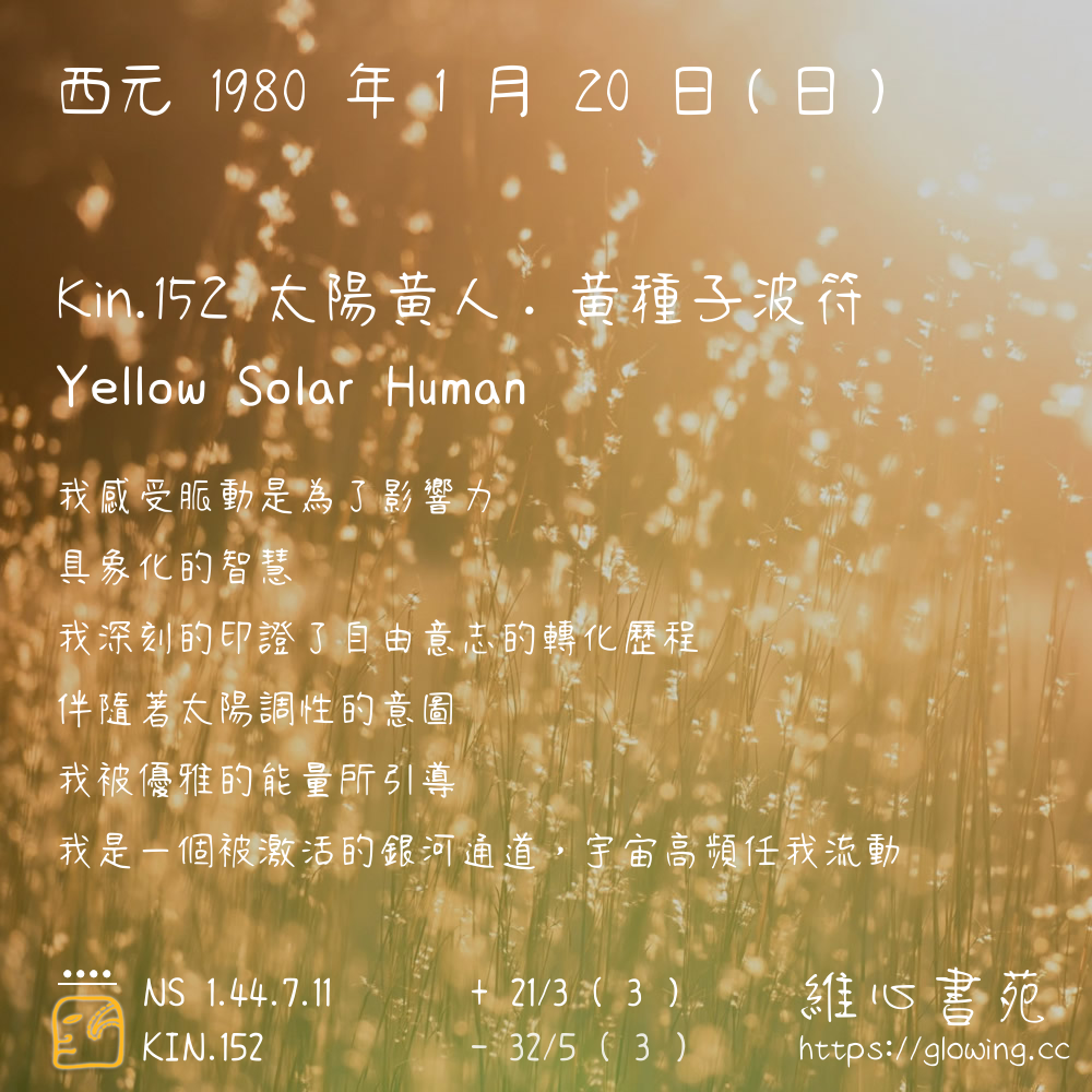我們可以稱 KIN 152 為 【太陽黃人】 、 【太陽的黃人】 、 【黃種子波符 之 太陽黃人】 也可以是 【太陽黃人.黃種子波符】 ,你比較喜歡哪一個稱號呢?