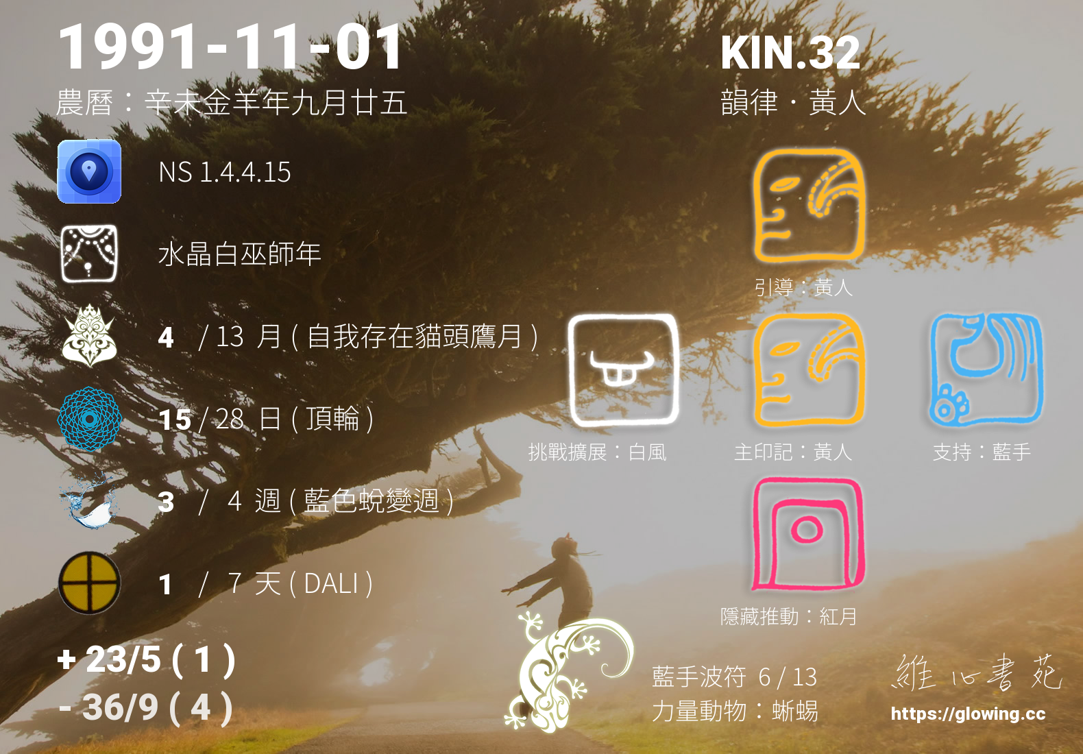 黃人的引導依據KIN的調性不同會有五種可能性,KIN.32的引導圖騰是黃人 , 黃人引導著我們崇尚智慧,探求內心的平靜能量,在一次次更深入看見自己內在的過程,我們能夠更清楚,所有的連結無須外求,我與內在的連結越緊密,生命將越加的繽紛。