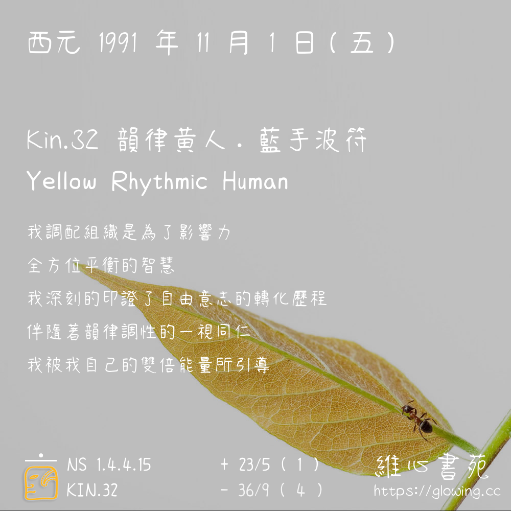 我們可以稱 KIN 32 為 【韻律黃人】 、 【韻律的黃人】 、 【藍手波符 之 韻律黃人】 也可以是 【韻律黃人.藍手波符】 ,你比較喜歡哪一個稱號呢?