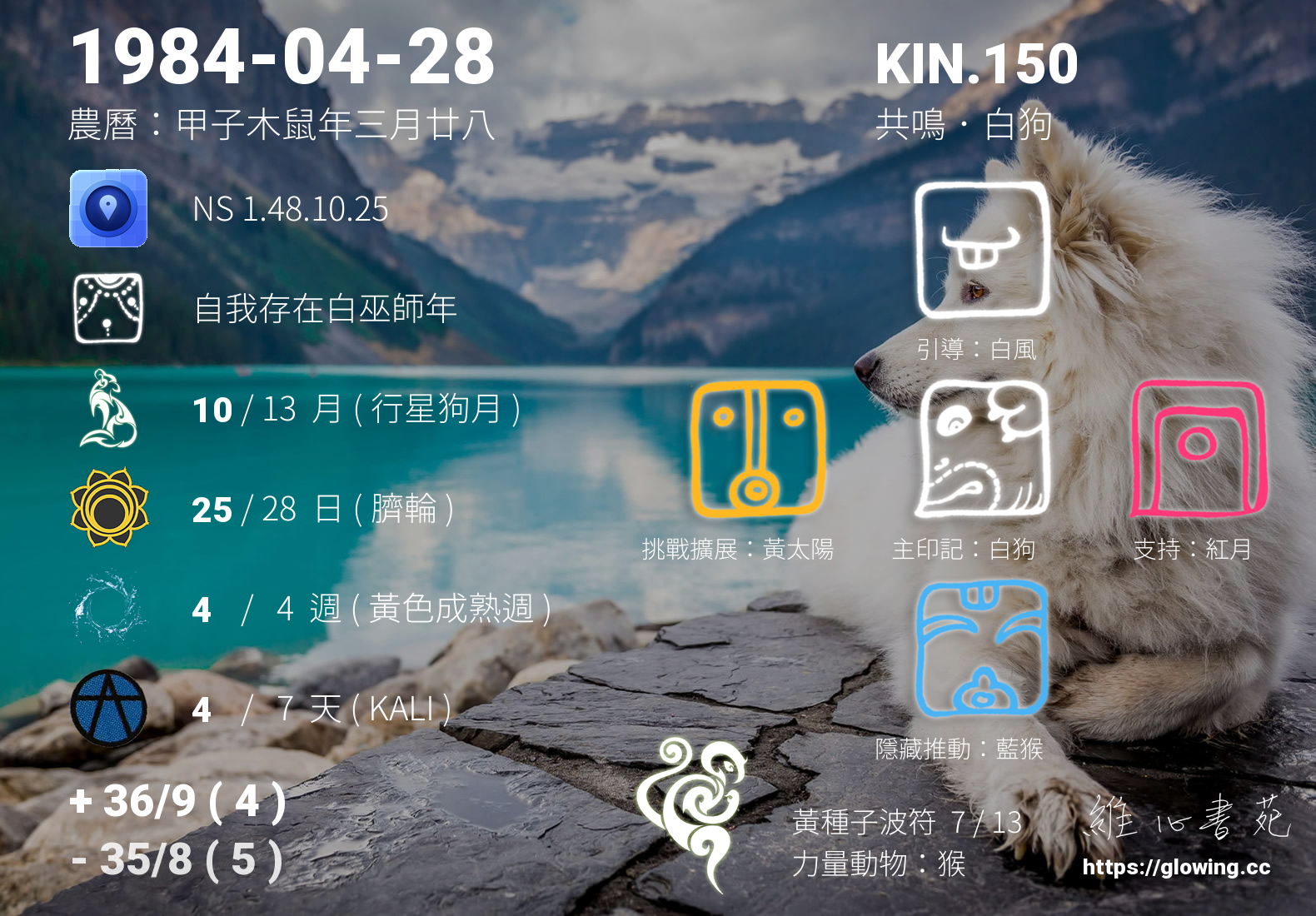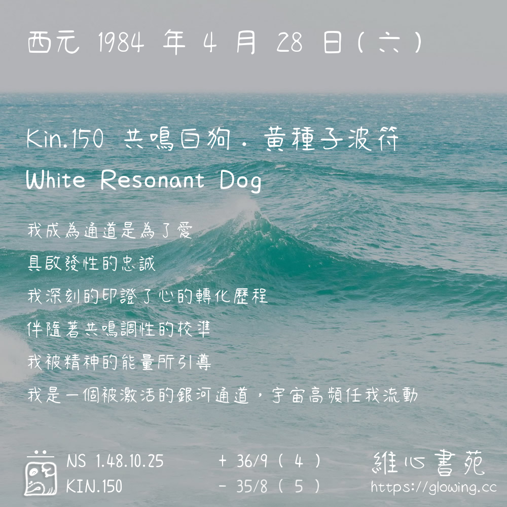 我們可以稱 KIN 150 為 【共鳴白狗】 、 【共鳴的白狗】 、 【黃種子波符 之 共鳴白狗】 也可以是 【共鳴白狗.黃種子波符】 ,你比較喜歡哪一個稱號呢?