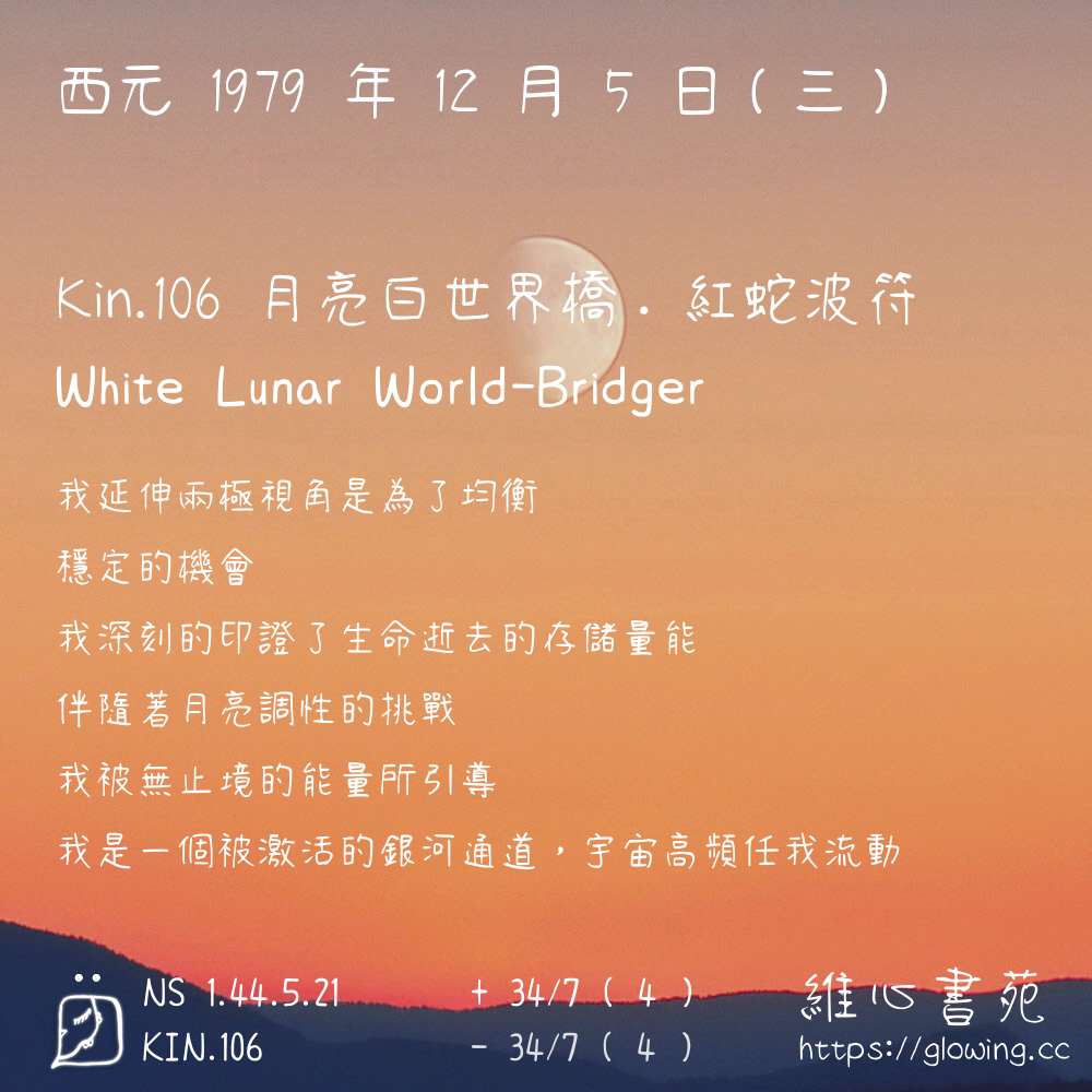 我們可以稱 KIN 106 為 【月亮白世界橋】 、 【月亮的白世界橋】 、 【紅蛇波符 之 月亮白世界橋】 也可以是 【月亮白世界橋.紅蛇波符】 ,你比較喜歡哪一個稱號呢?