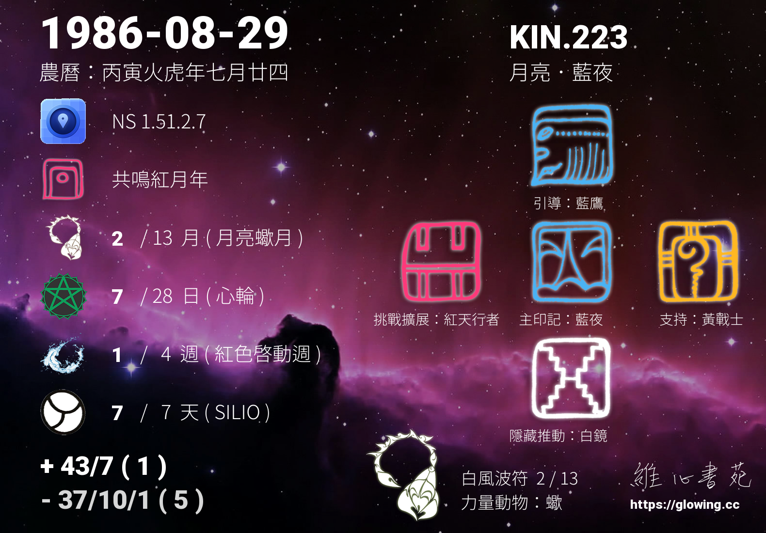 我們可以稱 KIN 223 為 【月亮藍夜】 、 【月亮的藍夜】 、 【白風波符 之 月亮藍夜】 也可以是 【月亮藍夜.白風波符】 ,你比較喜歡哪一個稱號呢?