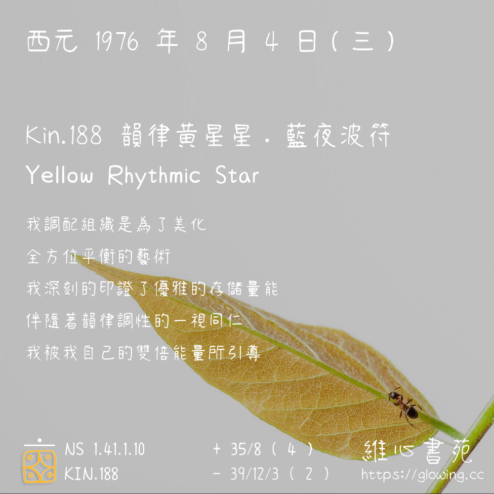 我們可以稱 KIN 188 為 【韻律黃星星】 、 【韻律的黃星星】 、 【藍夜波符 之 韻律黃星星】 也可以是 【韻律黃星星.藍夜波符】 ,你比較喜歡哪一個稱號呢?
