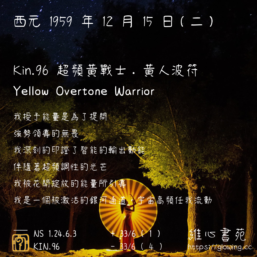 我們可以稱 KIN 96 為 【超頻黃戰士】 、 【超頻的黃戰士】 、 【黃人波符 之 超頻黃戰士】 也可以是 【超頻黃戰士.黃人波符】 ,你比較喜歡哪一個稱號呢?
