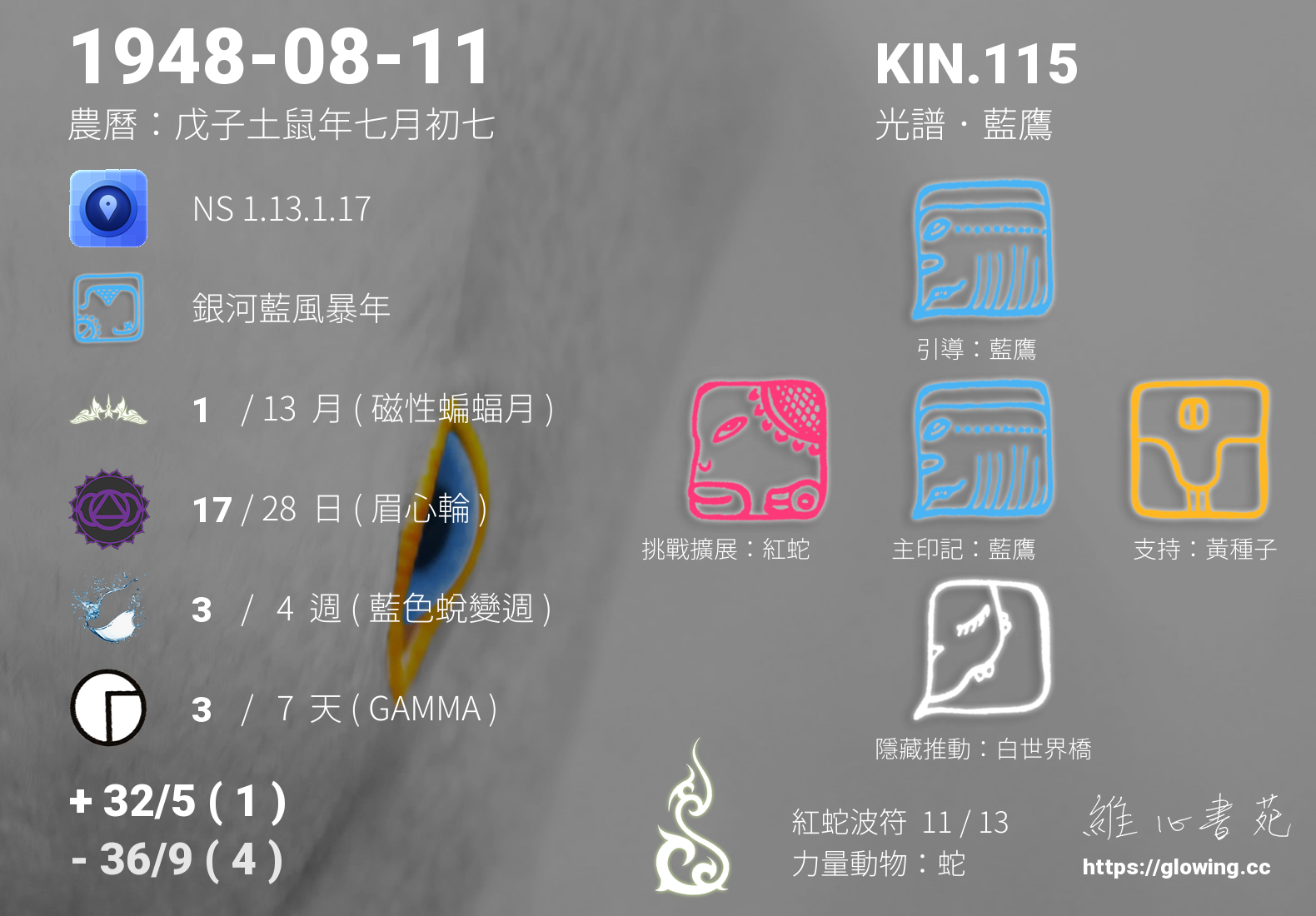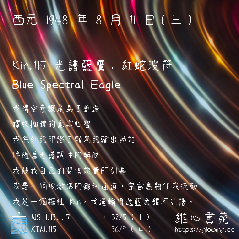 我們可以稱 KIN 115 為 【光譜藍鷹】 、 【光譜的藍鷹】 、 【紅蛇波符 之 光譜藍鷹】 也可以是 【光譜藍鷹.紅蛇波符】 ,你比較喜歡哪一個稱號呢?