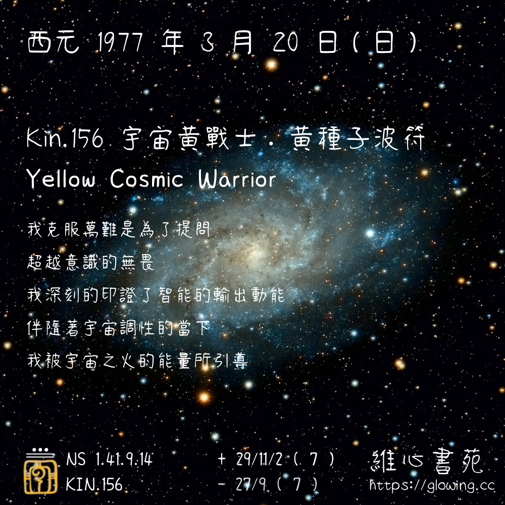 我們可以稱 KIN 156 為 【宇宙黃戰士】 、 【宇宙的黃戰士】 、 【黃種子波符 之 宇宙黃戰士】 也可以是 【宇宙黃戰士.黃種子波符】 ,你比較喜歡哪一個稱號呢?