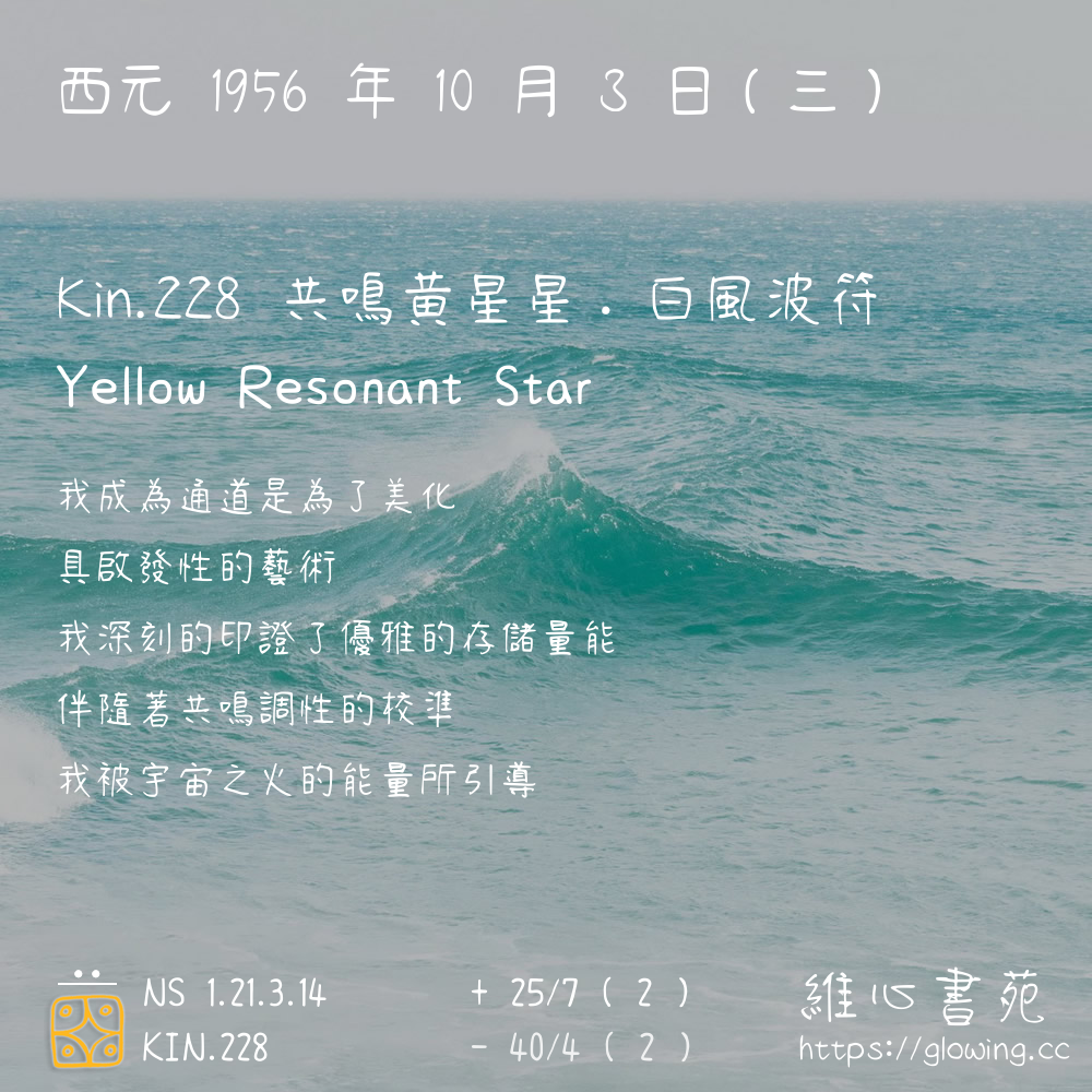 我們可以稱 KIN 228 為 【共鳴黃星星】 、 【共鳴的黃星星】 、 【白風波符 之 共鳴黃星星】 也可以是 【共鳴黃星星.白風波符】 ,你比較喜歡哪一個稱號呢?