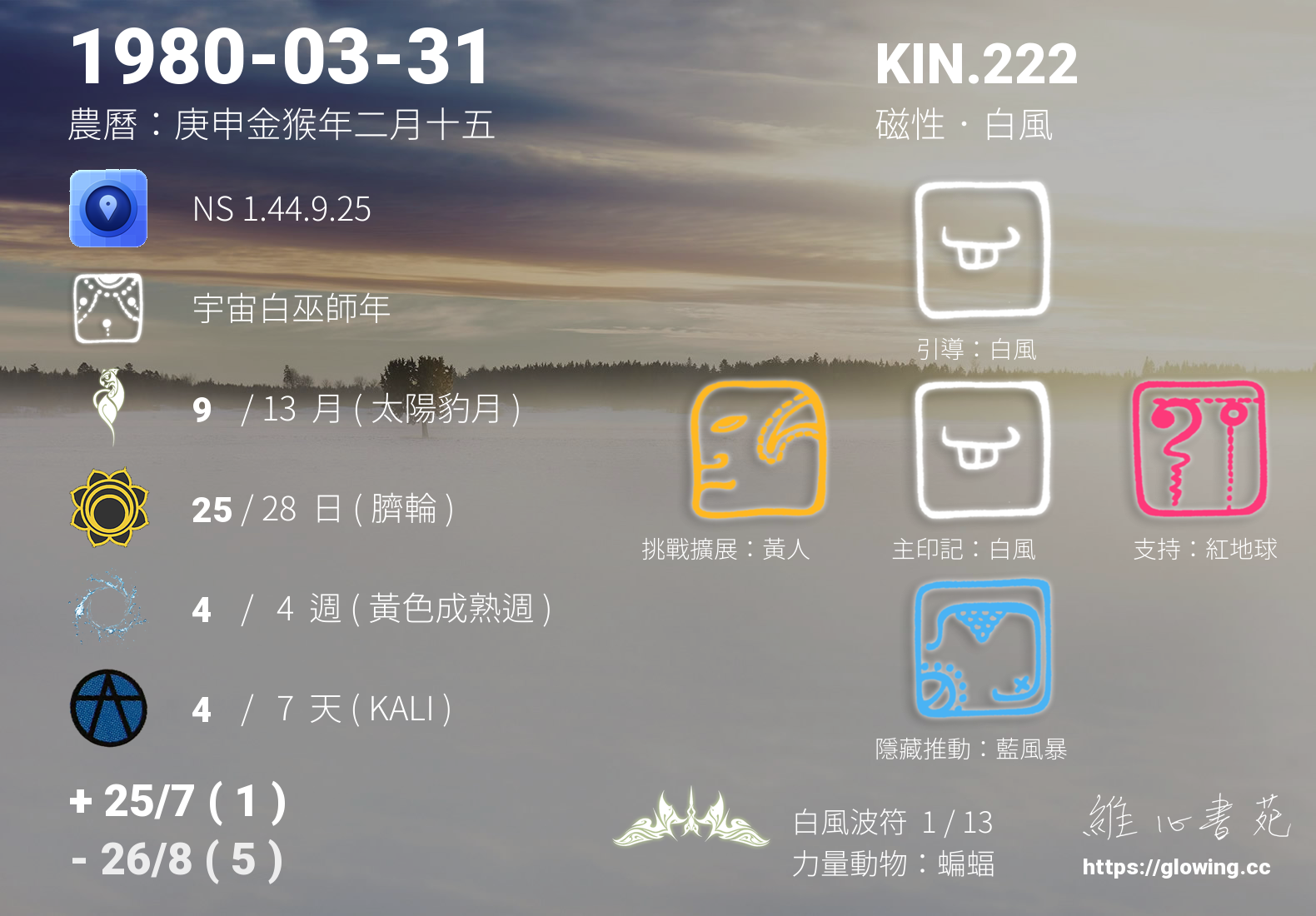 白風的引導依據KIN的調性不同會有五種可能性,KIN.222的引導圖騰是白風 , 在白風的引導下,我們理解到沒有什麼是沒有能量的,所有的言語可以幻化成純然的愛或鋒利的劍,可惜的是,我們並不能從發話口中決定最終的能量態樣,受話人的能量品質決定了言語能量的質量。