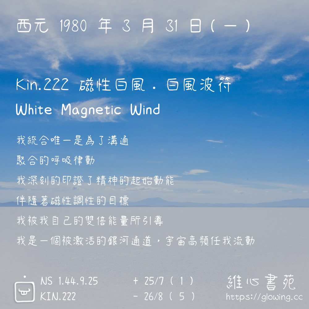 我們可以稱 KIN 222 為 【磁性白風】 、 【磁性的白風】 、 【白風波符 之 磁性白風】 也可以是 【磁性白風.白風波符】 ,你比較喜歡哪一個稱號呢?