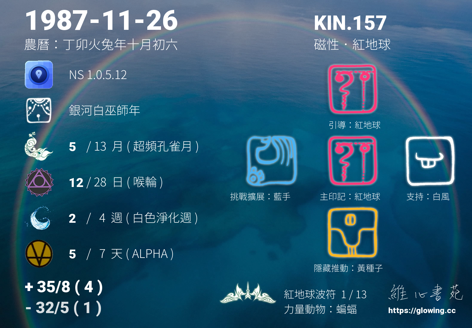 KIN.157 位於 紅地球波符 13 天中的第 1 天,銀河音階為調性 1
