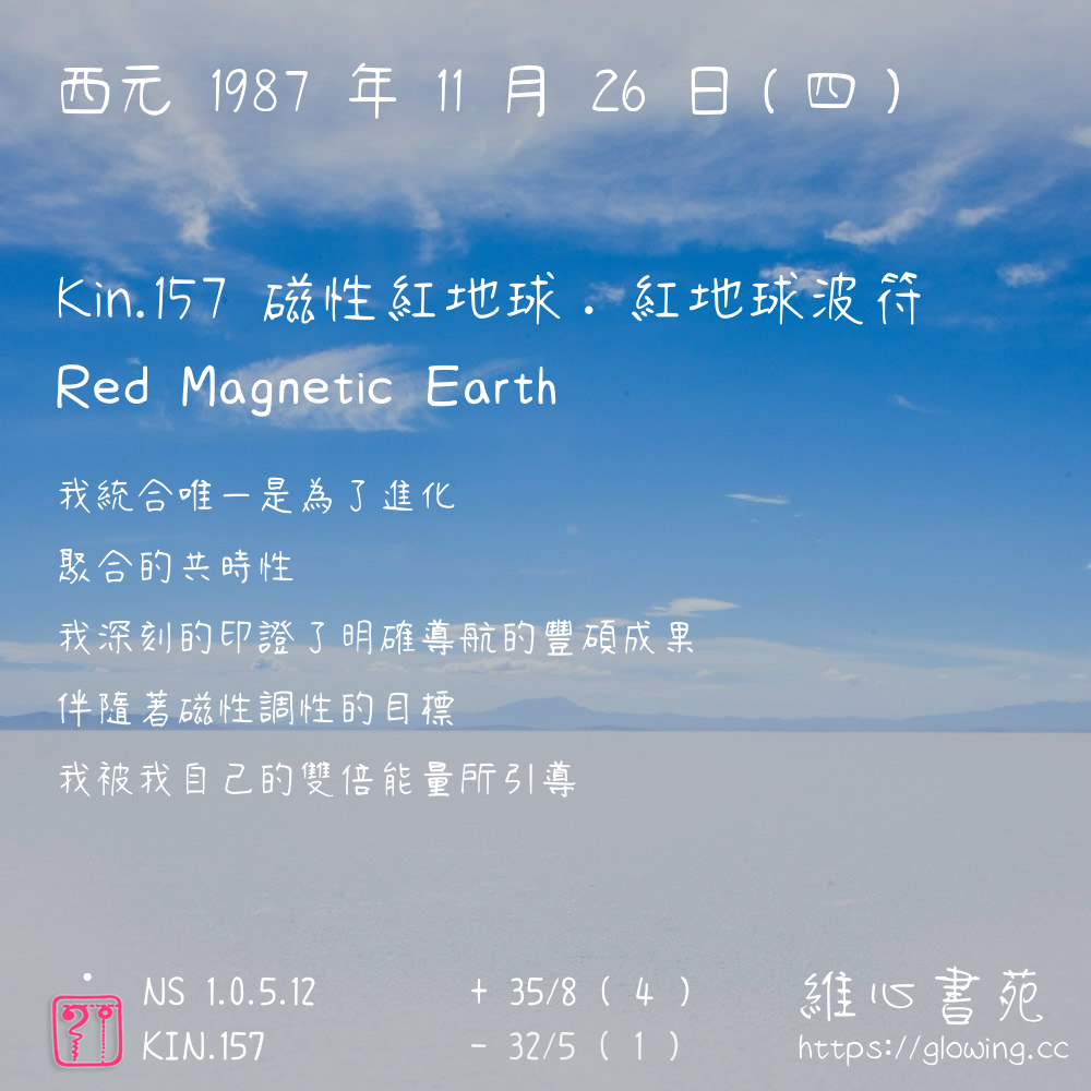 我們可以稱 KIN 157 為 【磁性紅地球】 、 【磁性的紅地球】 、 【紅地球波符 之 磁性紅地球】 也可以是 【磁性紅地球.紅地球波符】 ,你比較喜歡哪一個稱號呢?