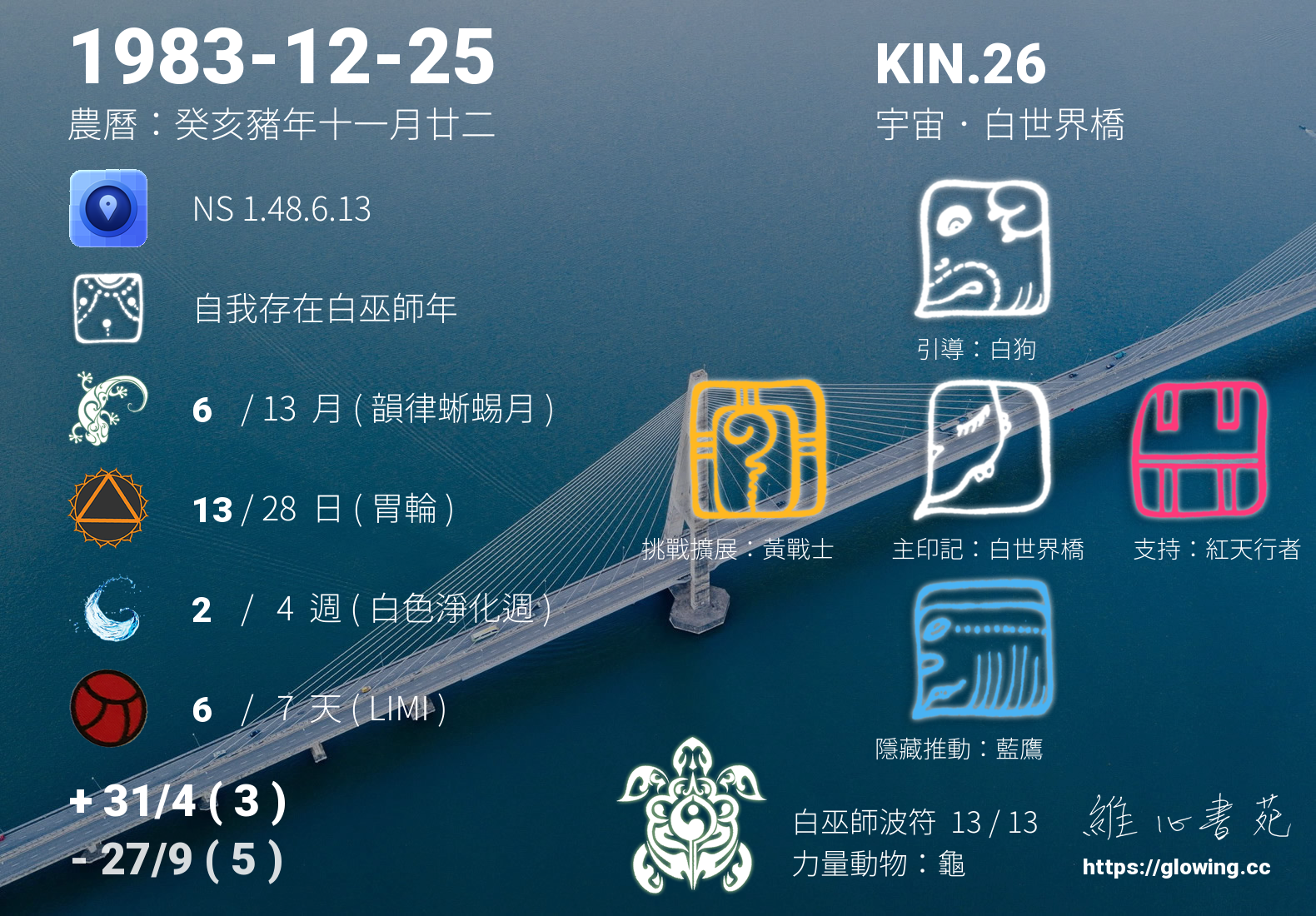 白世界橋的引導依據KIN的調性不同會有五種可能性,KIN.26的引導圖騰是白狗 , 沒有白狗的引導,我們沒有辦法體會到具象的愛,真實的能量流動,需要伴隨著具象的行為模式,白狗的愛相當的純粹、自然且生動現實,我們可以全然的接受,那發自內心毫無一絲污漬的潔淨純白。