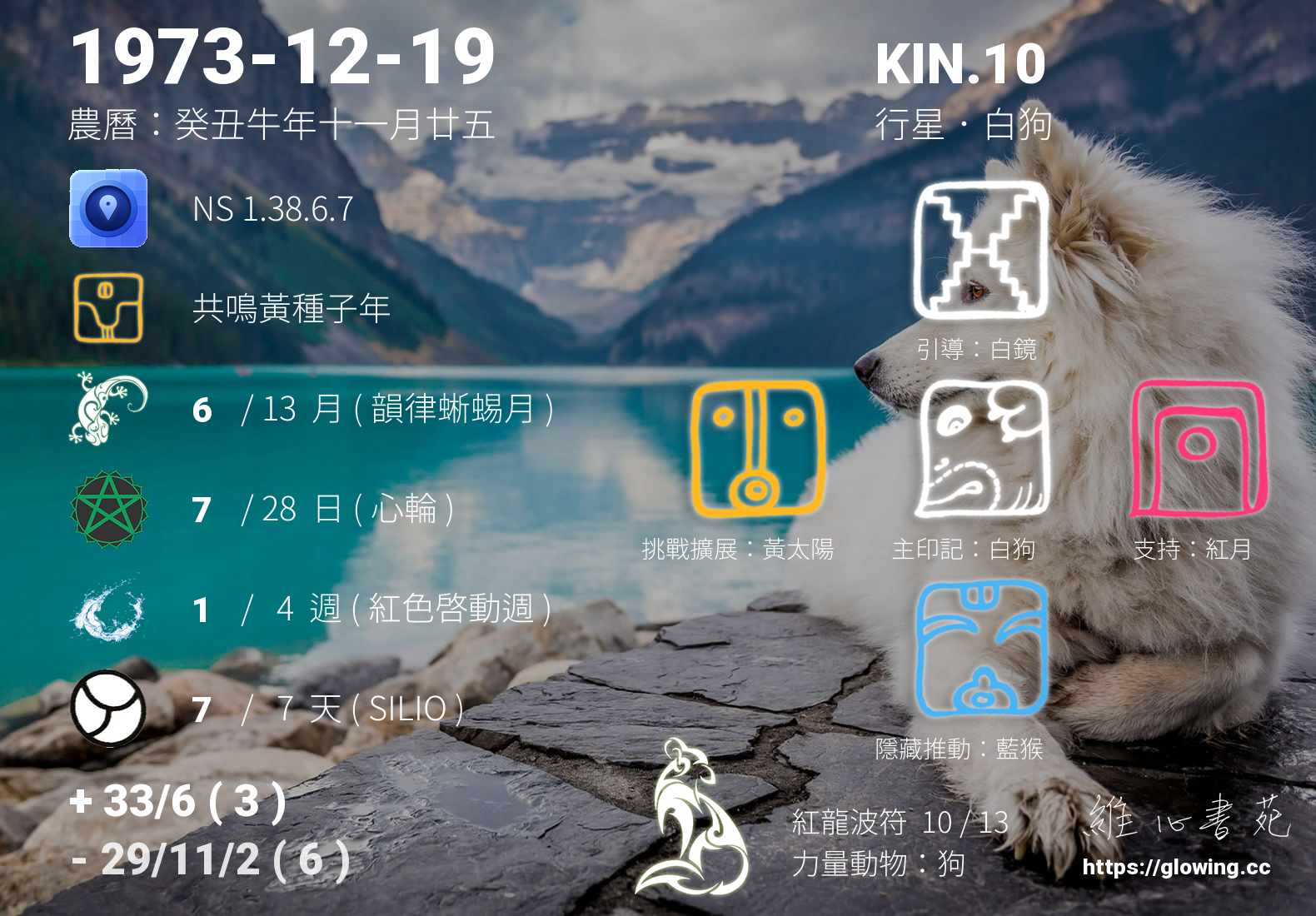 白狗的引導依據KIN的調性不同會有五種可能性,KIN.10的引導圖騰是白鏡 , 白鏡引導著我們認清自我,為我們的未來留下紀錄,將我們每一個思緒紀錄在天體運行中,在我們回歸的那個當下,迴向各所有的存在與眾生,為這個世界留下美麗色彩。