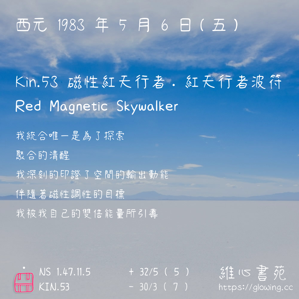 我們可以稱 KIN 53 為 【磁性紅天行者】 、 【磁性的紅天行者】 、 【紅天行者波符 之 磁性紅天行者】 也可以是 【磁性紅天行者.紅天行者波符】 ,你比較喜歡哪一個稱號呢?