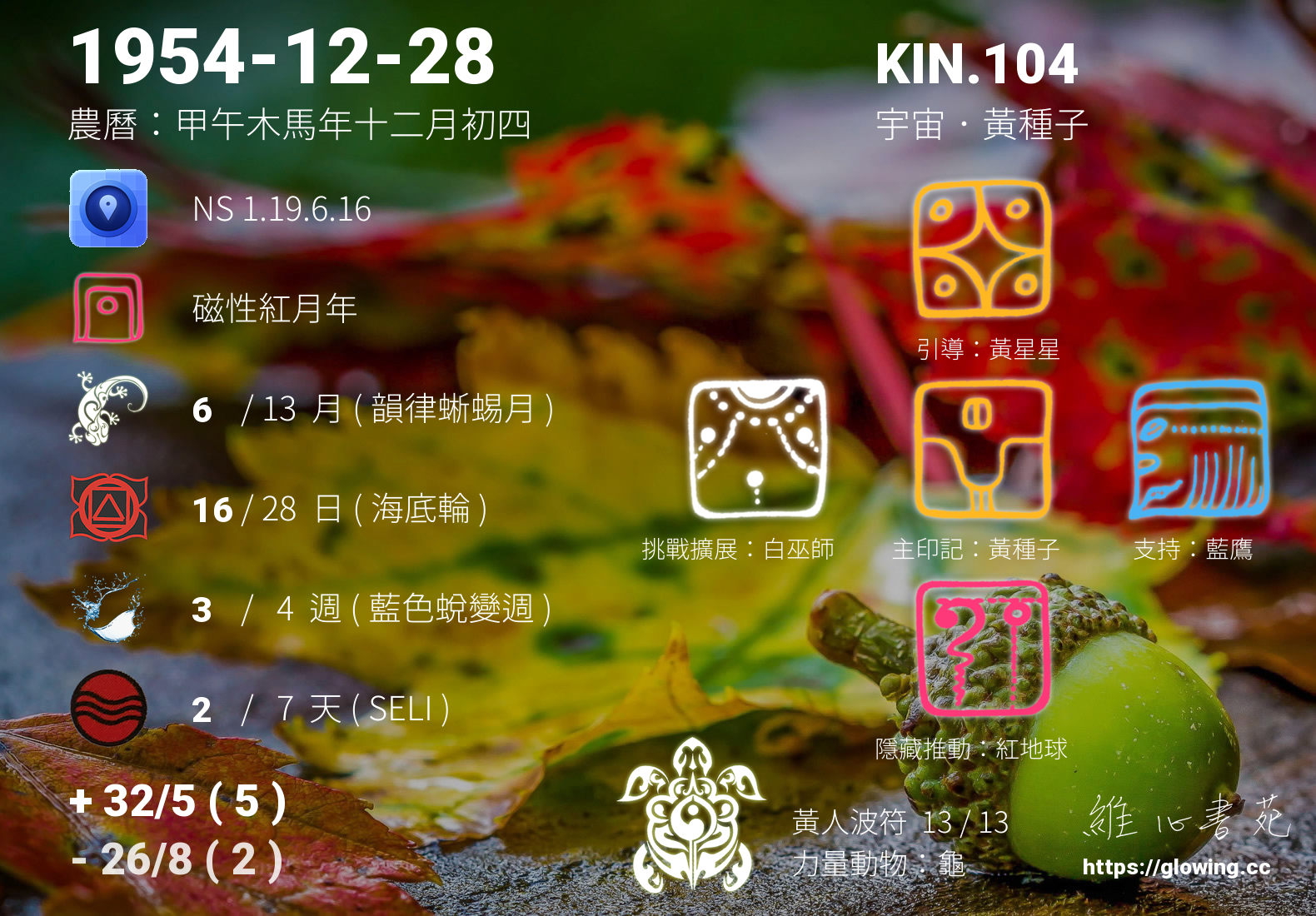 我們可以稱 KIN 104 為 【宇宙黃種子】 、 【宇宙的黃種子】 、 【黃人波符 之 宇宙黃種子】 也可以是 【宇宙黃種子.黃人波符】 ,你比較喜歡哪一個稱號呢?