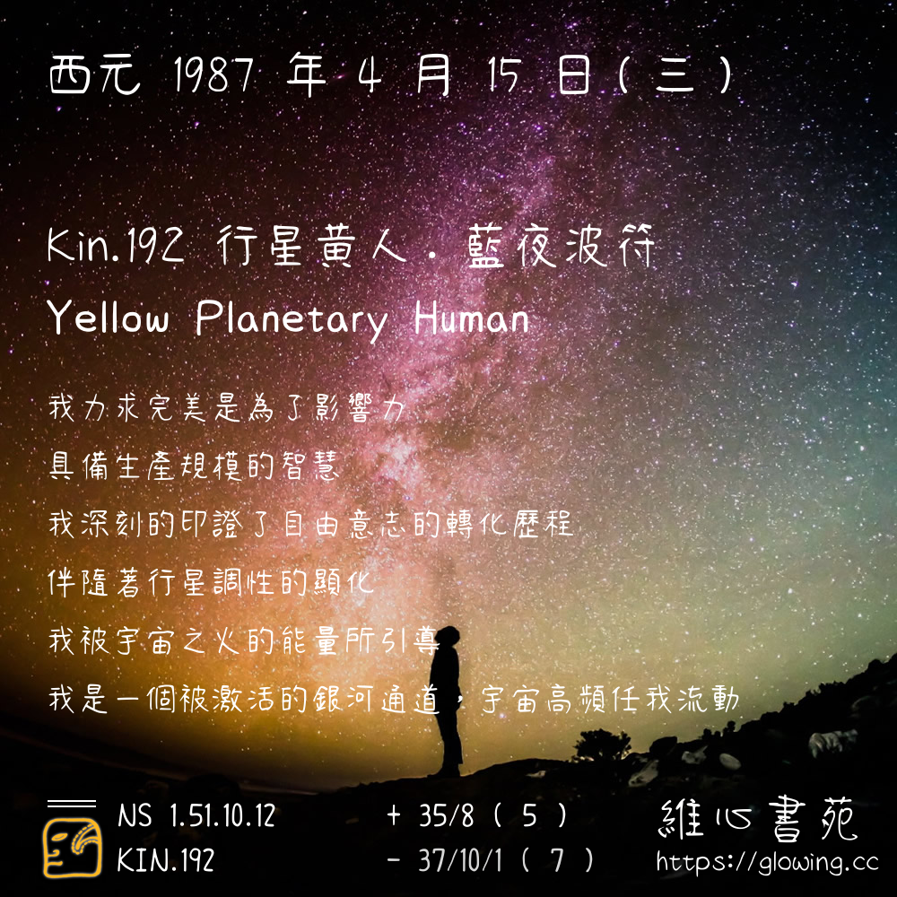 我們可以稱 KIN 192 為 【行星黃人】 、 【行星的黃人】 、 【藍夜波符 之 行星黃人】 也可以是 【行星黃人.藍夜波符】 ,你比較喜歡哪一個稱號呢?