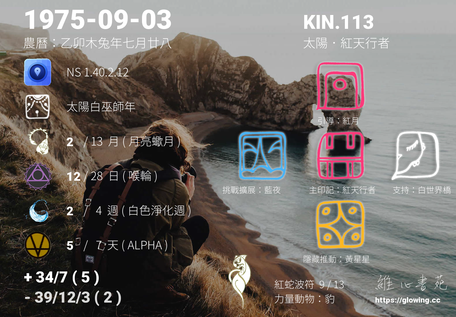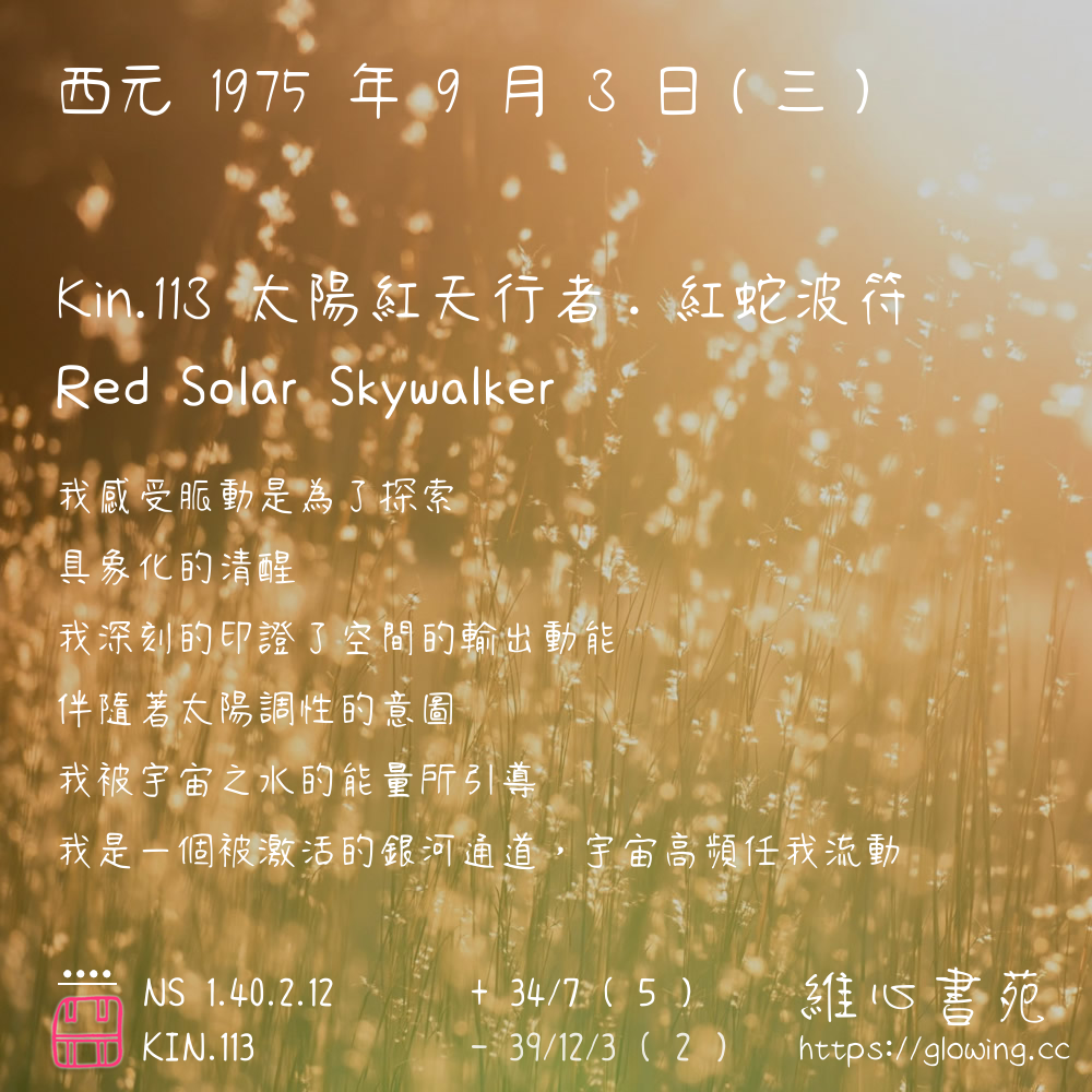 我們可以稱 KIN 113 為 【太陽紅天行者】 、 【太陽的紅天行者】 、 【紅蛇波符 之 太陽紅天行者】 也可以是 【太陽紅天行者.紅蛇波符】 ,你比較喜歡哪一個稱號呢?