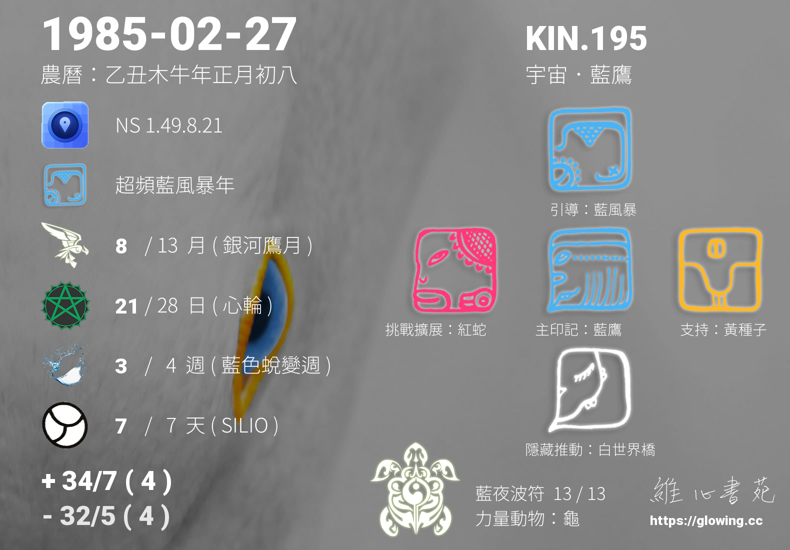 我們可以稱 KIN 195 為 【宇宙藍鷹】 、 【宇宙的藍鷹】 、 【藍夜波符 之 宇宙藍鷹】 也可以是 【宇宙藍鷹.藍夜波符】 ,你比較喜歡哪一個稱號呢?