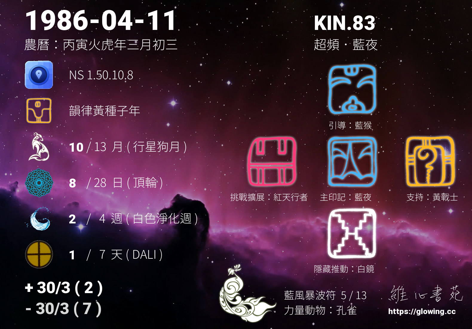 我們可以稱 KIN 83 為 【超頻藍夜】 、 【超頻的藍夜】 、 【藍風暴波符 之 超頻藍夜】 也可以是 【超頻藍夜.藍風暴波符】 ,你比較喜歡哪一個稱號呢?