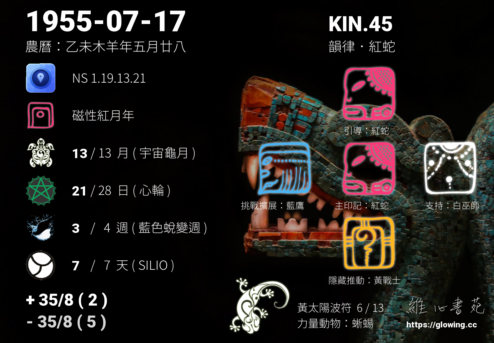 我們可以稱 KIN 45 為 【韻律紅蛇】 、 【韻律的紅蛇】 、 【黃太陽波符 之 韻律紅蛇】 也可以是 【韻律紅蛇.黃太陽波符】 ,你比較喜歡哪一個稱號呢?