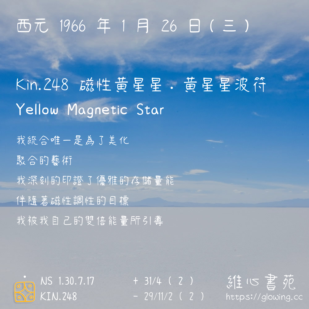 我們可以稱 KIN 248 為 【磁性黃星星】 、 【磁性的黃星星】 、 【黃星星波符 之 磁性黃星星】 也可以是 【磁性黃星星.黃星星波符】 ,你比較喜歡哪一個稱號呢?