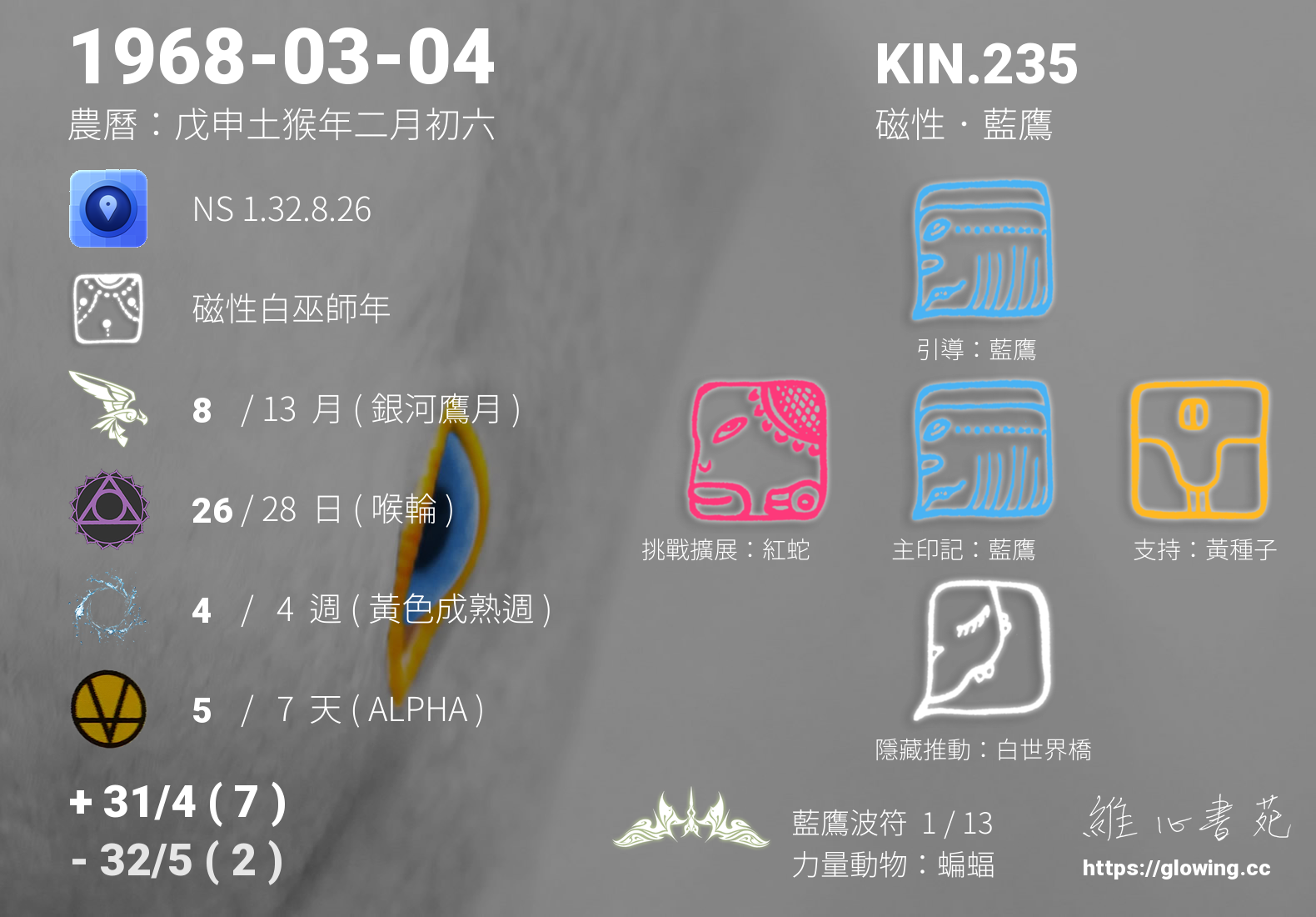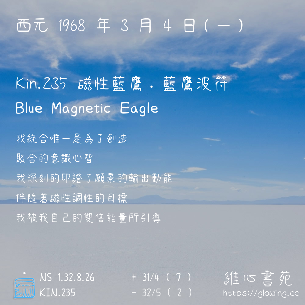 我們可以稱 KIN 235 為 【磁性藍鷹】 、 【磁性的藍鷹】 、 【藍鷹波符 之 磁性藍鷹】 也可以是 【磁性藍鷹.藍鷹波符】 ,你比較喜歡哪一個稱號呢?