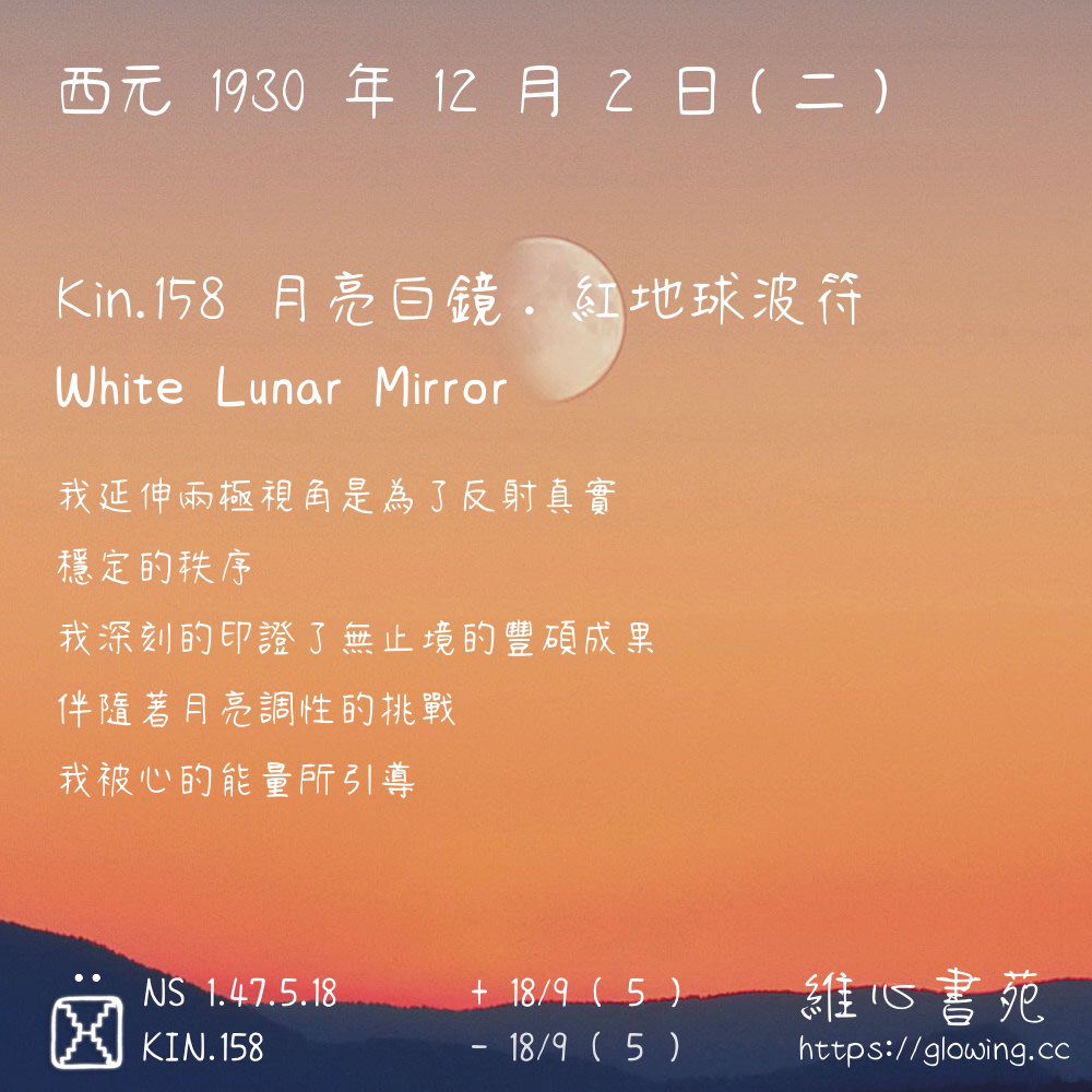 我們可以稱 KIN 158 為 【月亮白鏡】 、 【月亮的白鏡】 、 【紅地球波符 之 月亮白鏡】 也可以是 【月亮白鏡.紅地球波符】 ,你比較喜歡哪一個稱號呢?