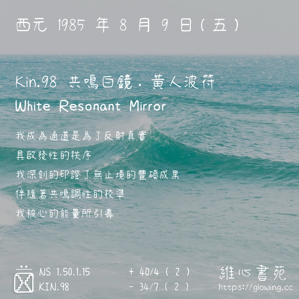 我們可以稱 KIN 98 為 【共鳴白鏡】 、 【共鳴的白鏡】 、 【黃人波符 之 共鳴白鏡】 也可以是 【共鳴白鏡.黃人波符】 ,你比較喜歡哪一個稱號呢?