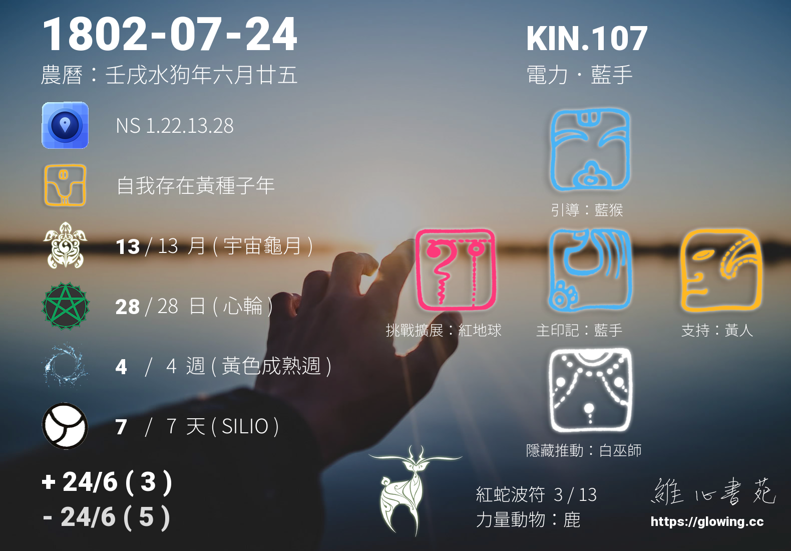 我們可以稱 KIN 107 為 【電力藍手】 、 【電力的藍手】 、 【紅蛇波符 之 電力藍手】 也可以是 【電力藍手.紅蛇波符】 ,你比較喜歡哪一個稱號呢?