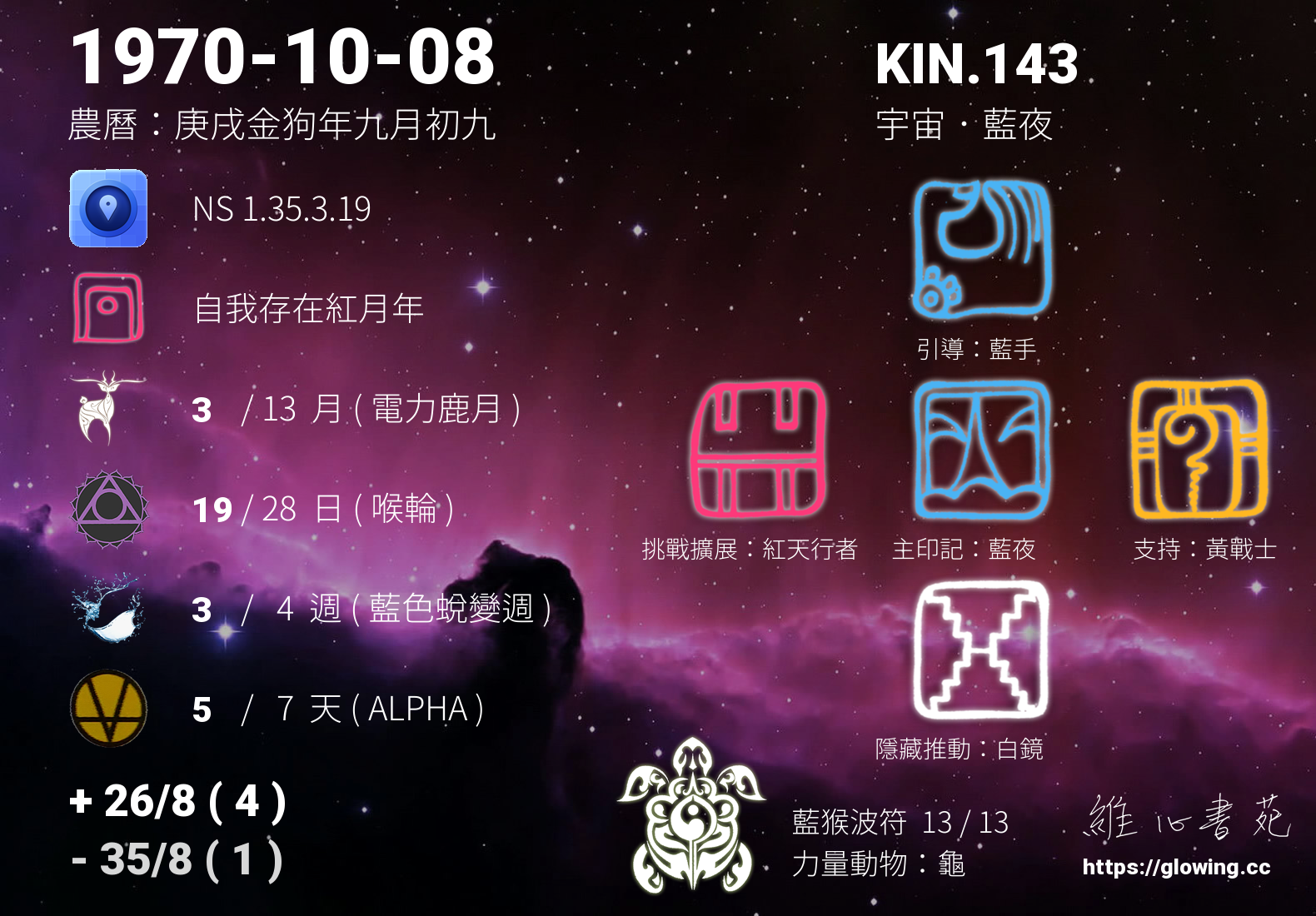 我們可以稱 KIN 143 為 【宇宙藍夜】 、 【宇宙的藍夜】 、 【藍猴波符 之 宇宙藍夜】 也可以是 【宇宙藍夜.藍猴波符】 ,你比較喜歡哪一個稱號呢?