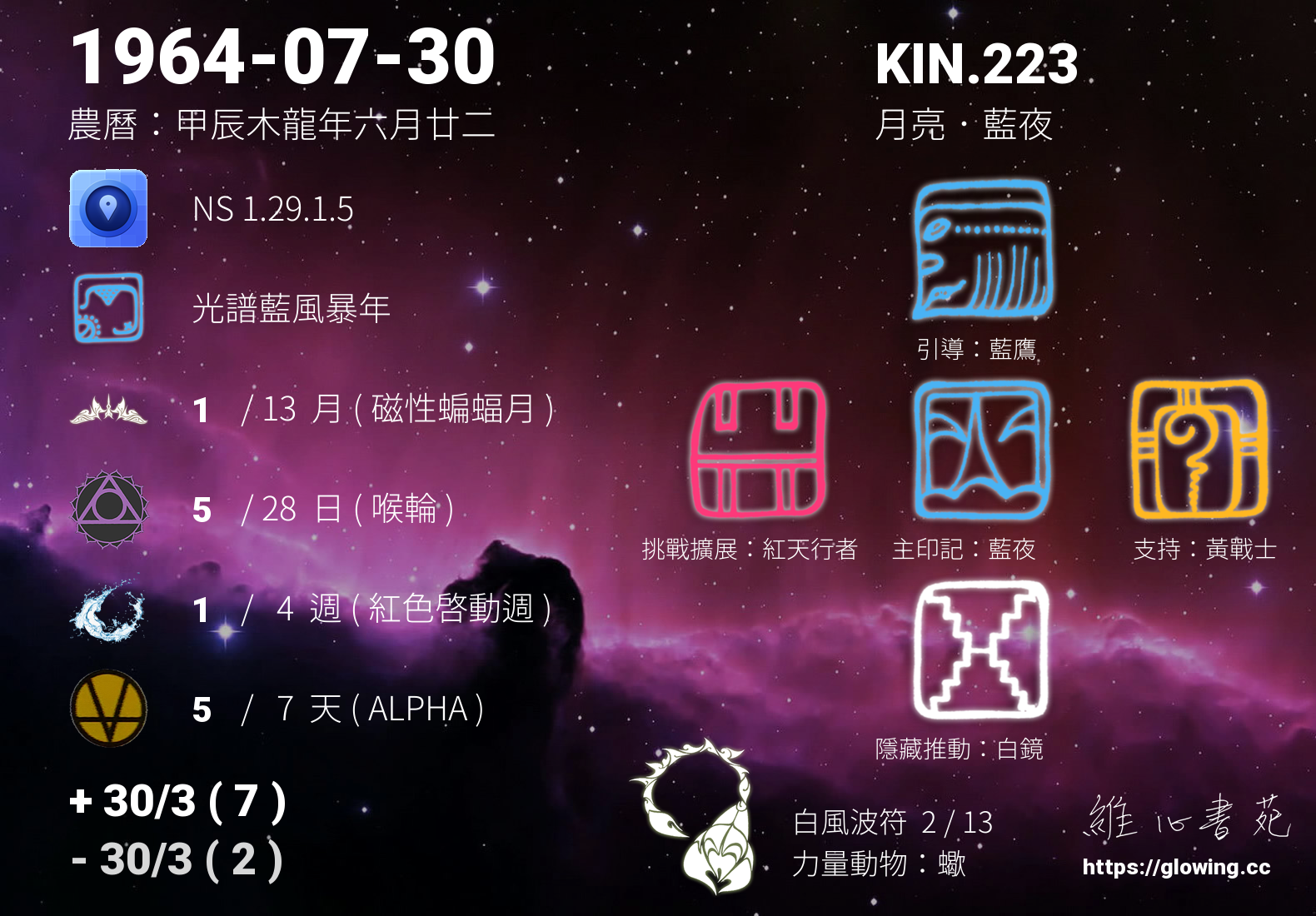 今天的星際原型圖騰為藍夜,我們稱之為主印記, 藍夜是夢想家的原型,有將夢想成真的天賦,直覺力強,在實踐夢想的過程中樂於分享將能更享豐盛。