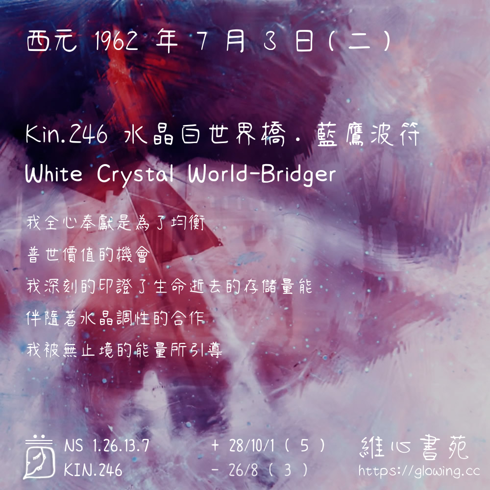 我們可以稱 KIN 246 為 【水晶白世界橋】 、 【水晶的白世界橋】 、 【藍鷹波符 之 水晶白世界橋】 也可以是 【水晶白世界橋.藍鷹波符】 ,你比較喜歡哪一個稱號呢?