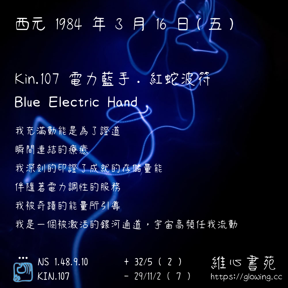我們可以稱 KIN 107 為 【電力藍手】 、 【電力的藍手】 、 【紅蛇波符 之 電力藍手】 也可以是 【電力藍手.紅蛇波符】 ,你比較喜歡哪一個稱號呢?